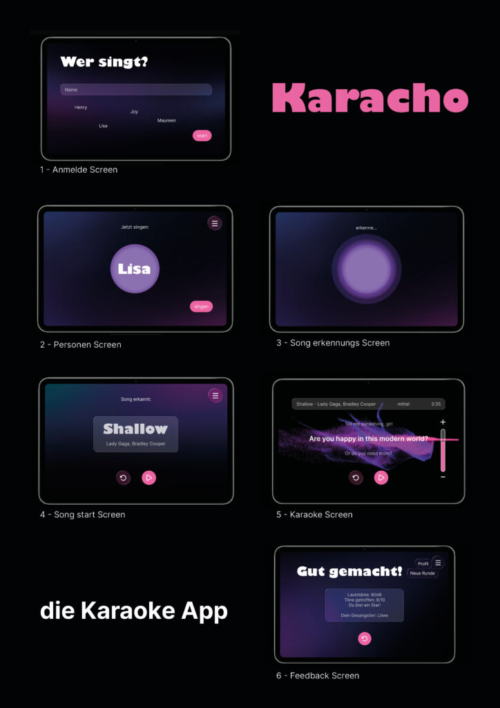Karacho ist eine App speziell entwickelt für die Verwendung in Karaoke Bars. Vor Ort wird sie auf einem Tablet von jeder Kleingruppe individuell bedient, ohne auf Barpersonal angewiesen zu sein.